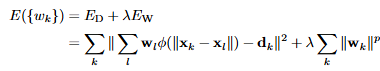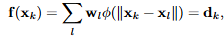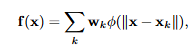 x = 평가 지점, xk = 흩어져 있는 데이터 지점, φ = radial basis functions(or kernel), wk = 가중치
